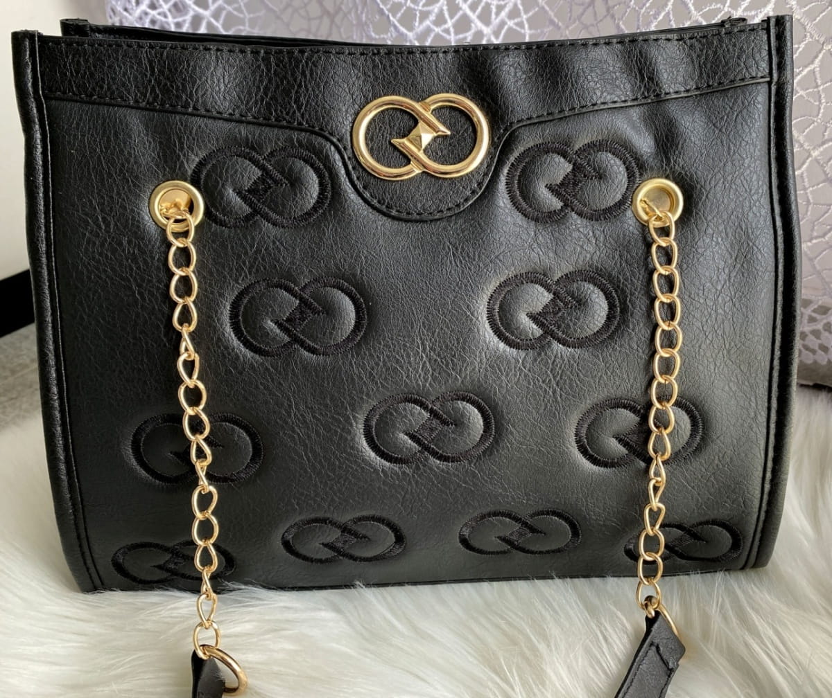 Czarna torebka na pasku i łańcuszku z haftem FB72