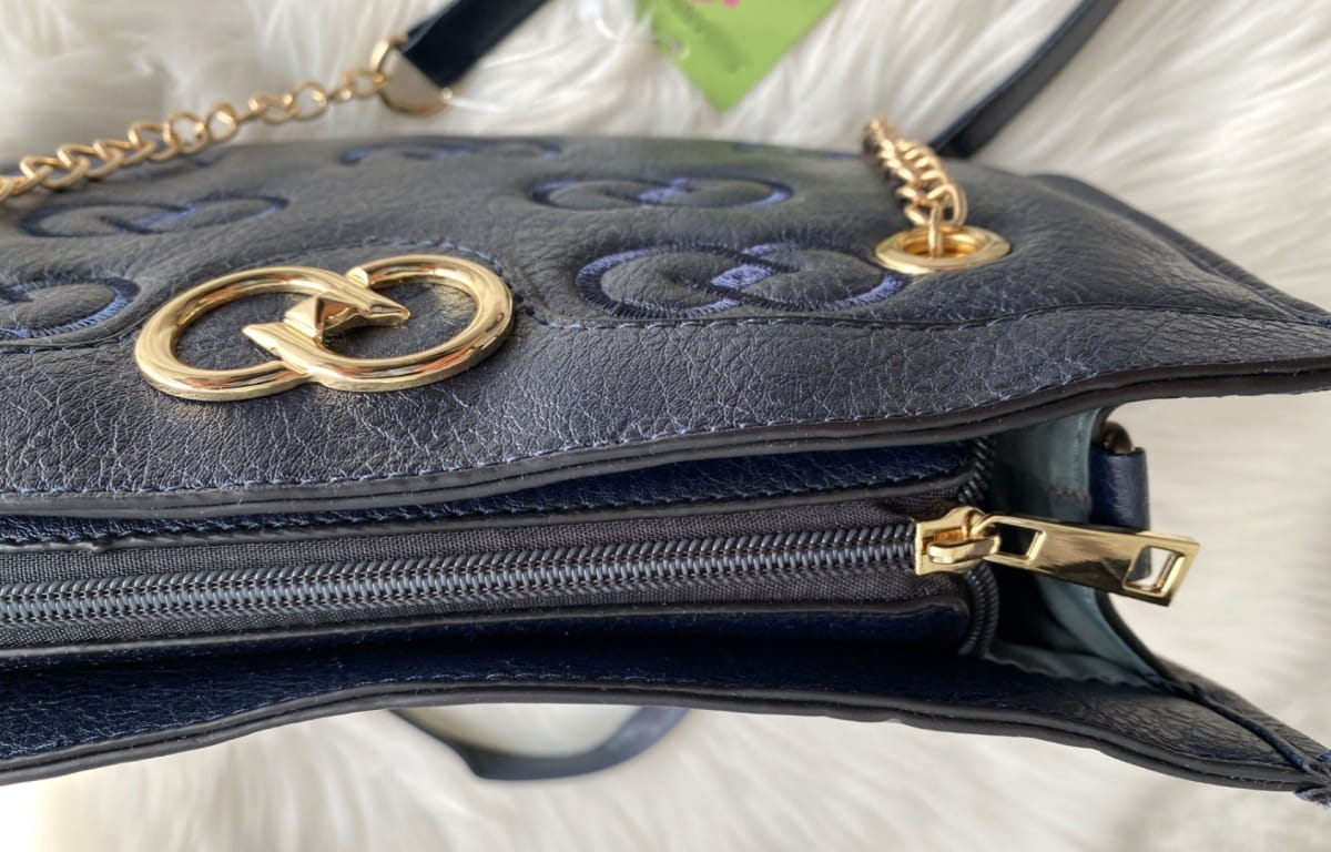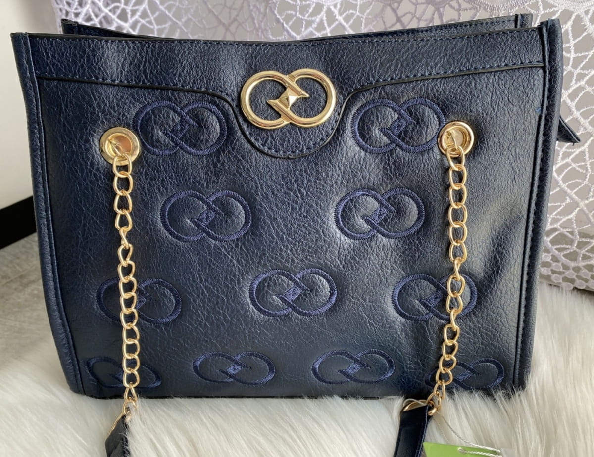 Granatowa torebka na pasku i łańcuszku z haftem FB72